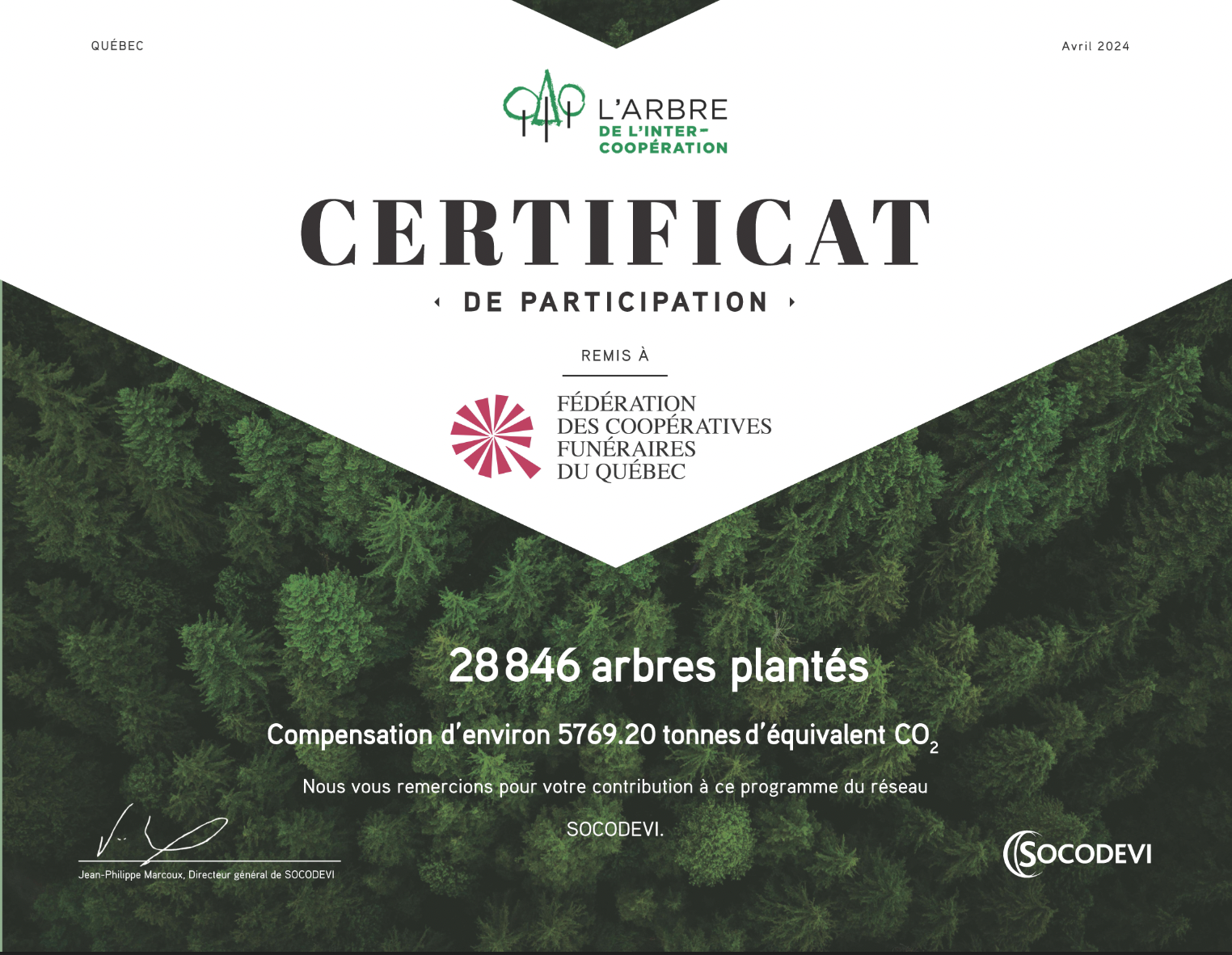En collaboration avec SOCODEVI, le Réseau des coopératives funéraires du Québec a procédé en juin 2009 à la première plantation d'arbres.